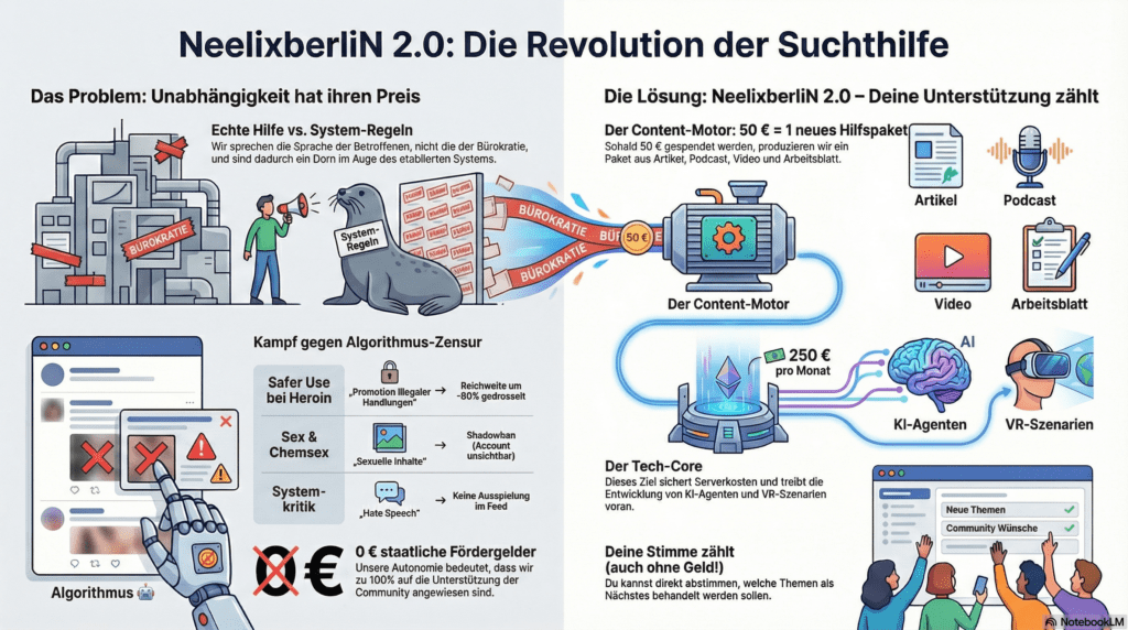 - Unabhängigkeit: Das Projekt operiert mit „0 Euro Steuergeldern“. Diese konsequente Ablehnung staatlicher Förderungen wird als Grundlage für absolute inhaltliche Freiheit und die Möglichkeit, „ohne Maulkorb“ zu agieren, dargestellt. Sie ist die Voraussetzung für die kritische Auseinandersetzung mit dem Suchthilfesystem.