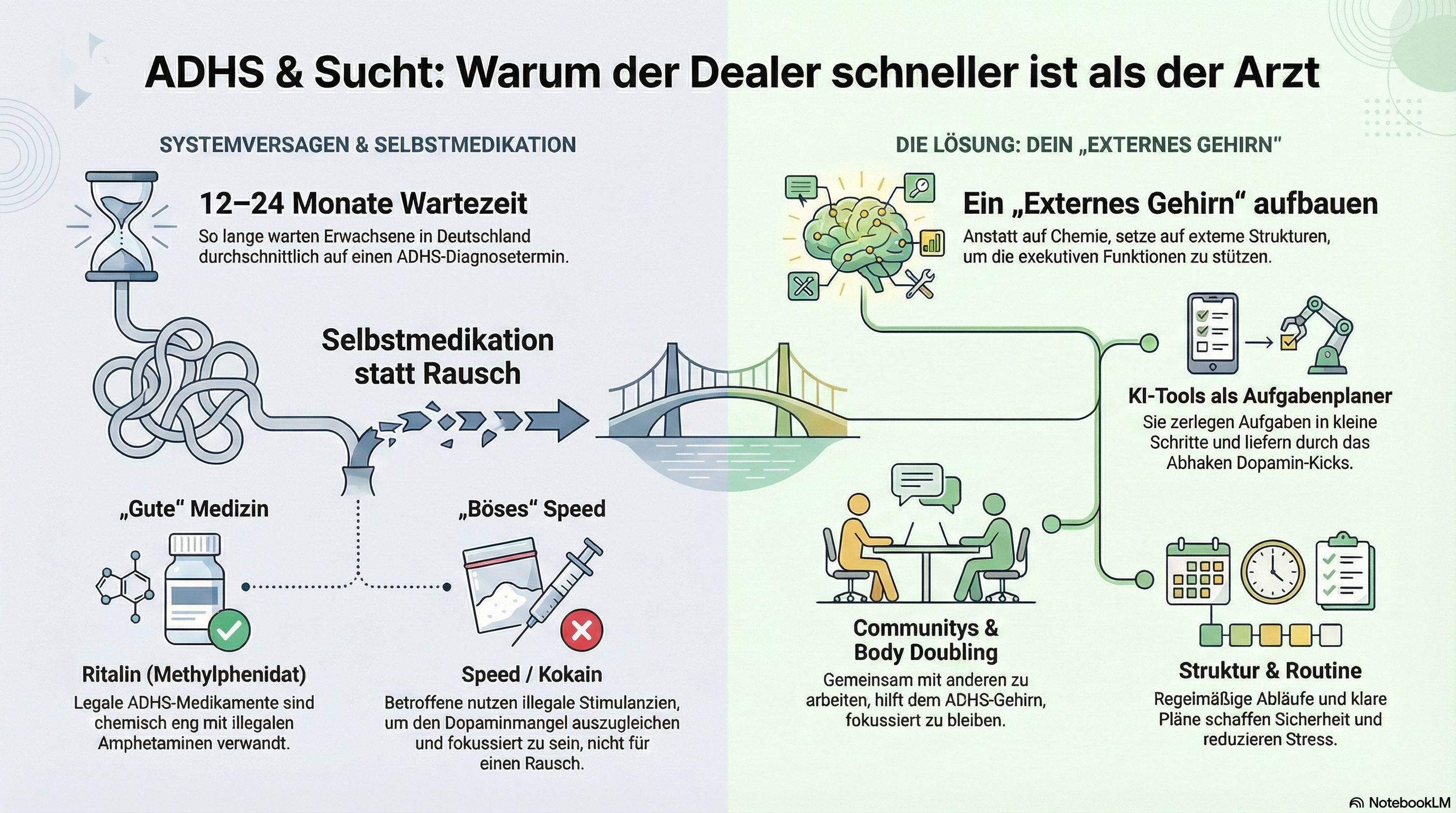 Für die Übergangszeit („Safer Use“): Nutzung von „externen Gehirnen“ (KI-Tools, Struktur-Apps) und Body-Doubling, um Dopamin durch Erfolgserlebnisse statt Chemie zu generieren.