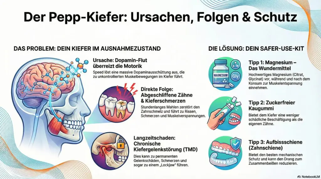 Der „Pepp-Kiefer“ ist mehr als nur eine nervige Nebenwirkung. Er ist ein lautes, schmerzhaftes Warnsignal deines Körpers, das dir unmissverständlich zeigt, wie massiv die Substanz dein zentrales Nervensystem überlastet. Hör auf dieses Signal. Die Schäden an Zähnen und Kiefergelenk sind oft schleichend, aber sie sind real und können dauerhaft sein. Wenn du konsumierst, dann tu es so risikoarm wie möglich. Dein Lächeln und dein Kiefer werden es dir danken.