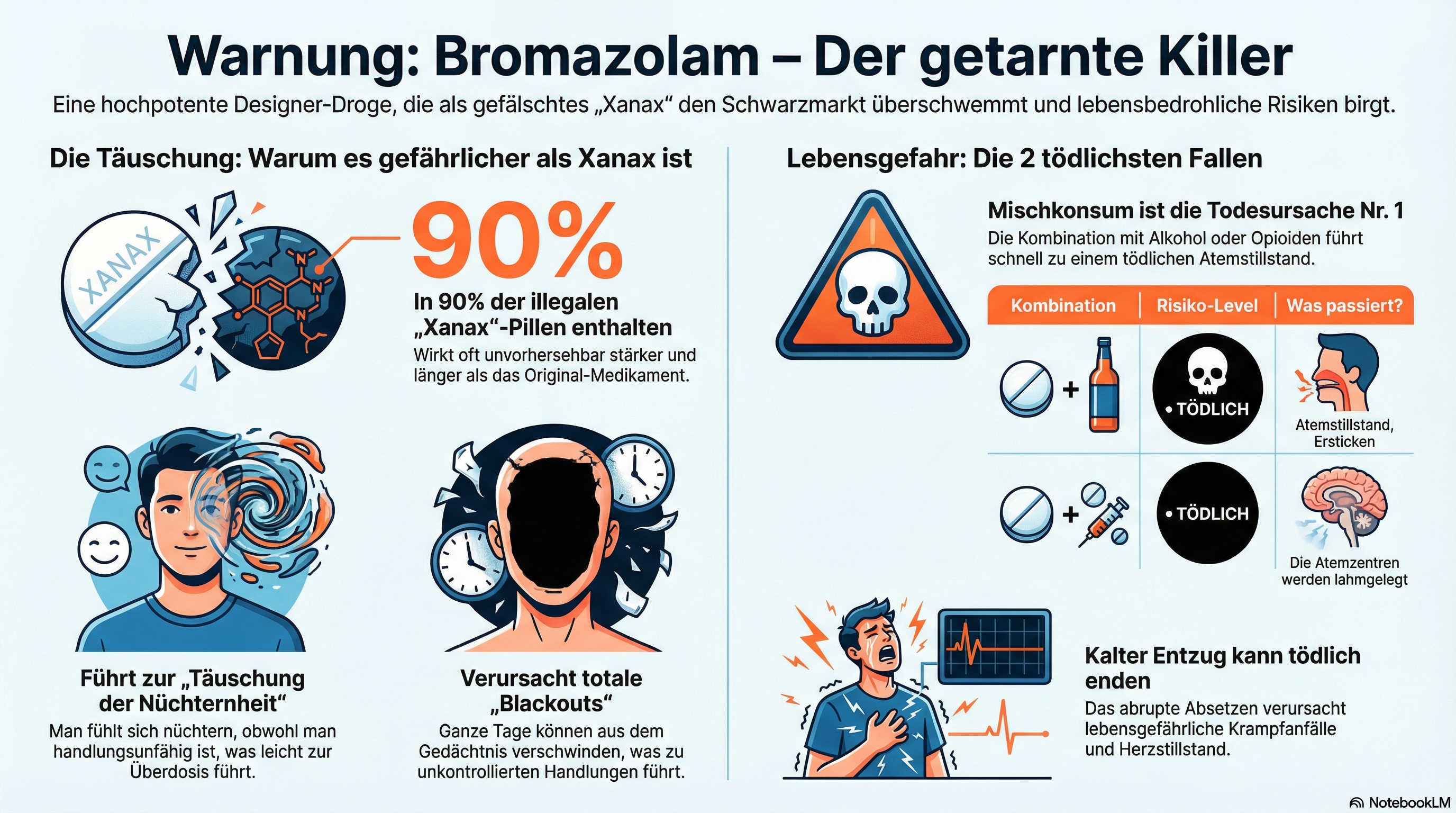 | Bromazolam + Alkohol | ⚫ TÖDLICH | Beide wirken auf GABA. Der Effekt potenziert sich nicht, er explodiert. Du hörst einfach auf zu atmen (Atemdepression) oder erstickst an deinem Erbrochenen. |