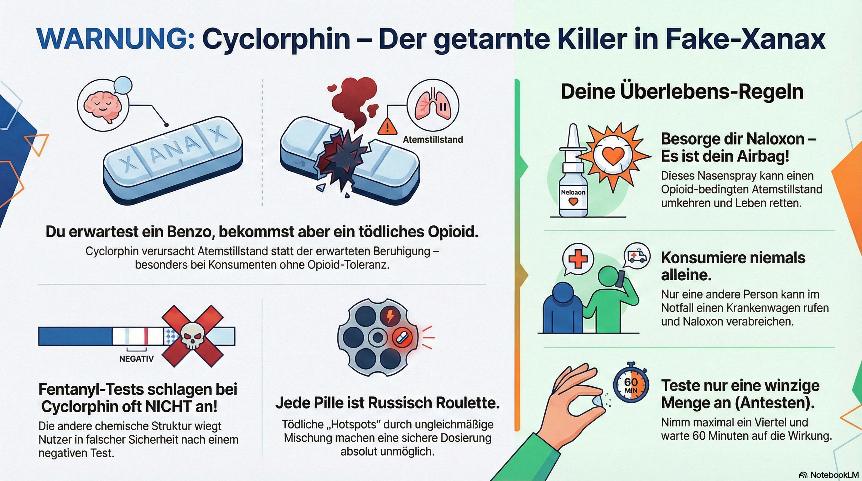 Dieser Leitfaden richtet sich an Fachkräfte der Drogen- und Suchtberatung und behandelt eine strategische Notlage, die unsere etablierten Protokolle fundamental infrage stellt. Seit im September 2025 in Deutschland erstmals die Substanz Cyclorphin in gefälschten Alprazolam-Tabletten nachgewiesen wurde, hat die „Fake Pill“-Krise eine neue, tödliche Qualität erreicht. Das Auftauchen dieses hochpotenten Opioids in Präparaten, die auf dem Schwarzmarkt als „Xanax“ oder ähnliches verkauft werden, stellt eine unmittelbare und tödliche Gefahr dar. Konsument*innen erwarten eine sedierende, angstlösende Wirkung, erhalten jedoch unwissentlich eine Substanz, die eine massive Atemdepression auslösen kann. Das Ziel dieses Dokuments ist es, Ihnen als Fachkräften praxisnahe, überlebenswichtige Informationen und konkrete Handlungsanweisungen für die tägliche Beratungsarbeit an die Hand zu geben.
