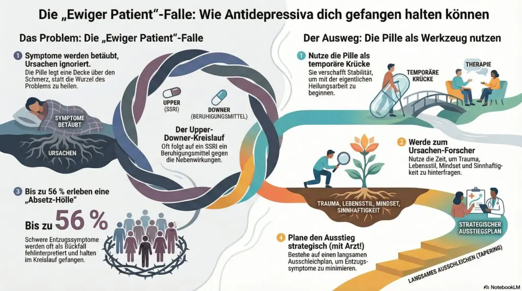 Antidepressiva können eine lebensrettende Krücke sein. Aber das System verkauft dir die Krücke oft als Heilung. Die Wahrheit ist: Sie betäuben nur den Schmerz, der dich auf dein wahres Problem hinweisen will. Solange du nur das Symptom bekämpfst, wirst du die Krankheit nie besiegen.