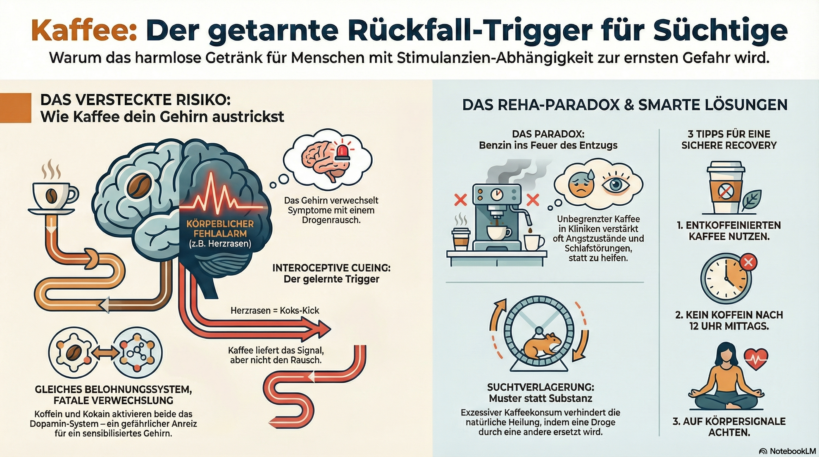 Besonders für Stimulanzien-Abhängige (Kokain, Speed, Crystal) ist Koffein kein Genussmittel, sondern ein getarnter Trigger. Wir müssen dringend darüber reden, warum wir in der Suchthilfe den Teufel mit dem Beelzebub austreiben und warum dein nervöses Zittern nach dem dritten Espresso für dein Suchtgedächtnis wie ein Startschuss wirkt.