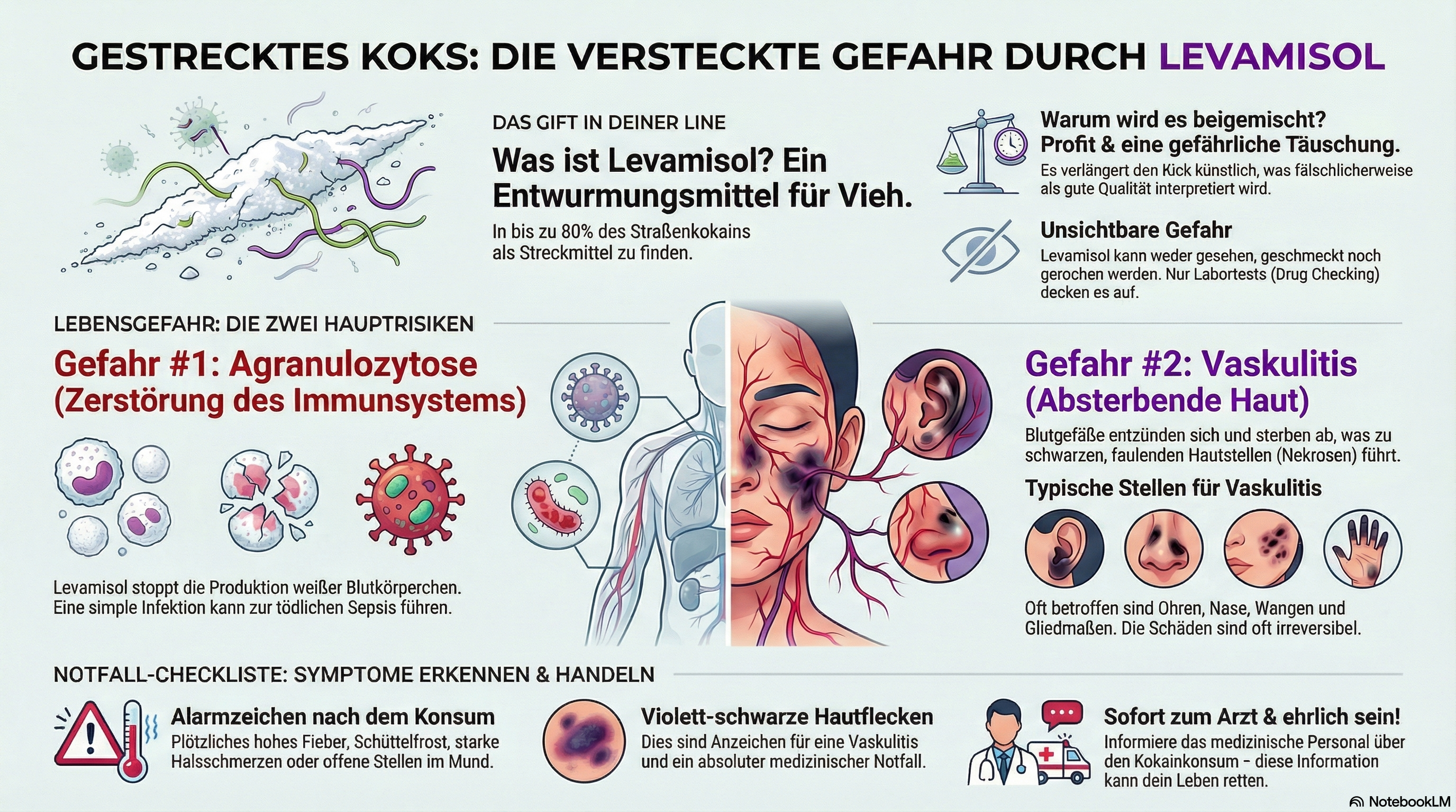 - Definition: Levamisol ist ein **Tier-Entwurmungsmittel**, das in bis zu 80% des Straßenkokains als Streckmittel enthalten ist, um den Rausch künstlich zu verlängern.