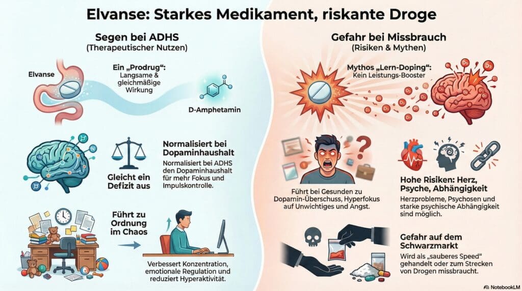 Lisdexamfetamin (Elvanse) ist für viele Menschen mit ADHS eine unglaublich wirksame und lebensverändernde Hilfe. Es ist aber ein potentes Amphetamin und kein harmloser Lern-Booster oder eine Partydroge. Der Missbrauch durch gesunde Menschen kann zu denselben Risiken führen wie bei anderen Amphetaminen: Herz-Kreislauf-Probleme, psychische Abhängigkeit und eine Störung der natürlichen Gehirnchemie. Die Einnahme und Dosierung gehören ausnahmslos in die Hände eines erfahrenen Arztes.