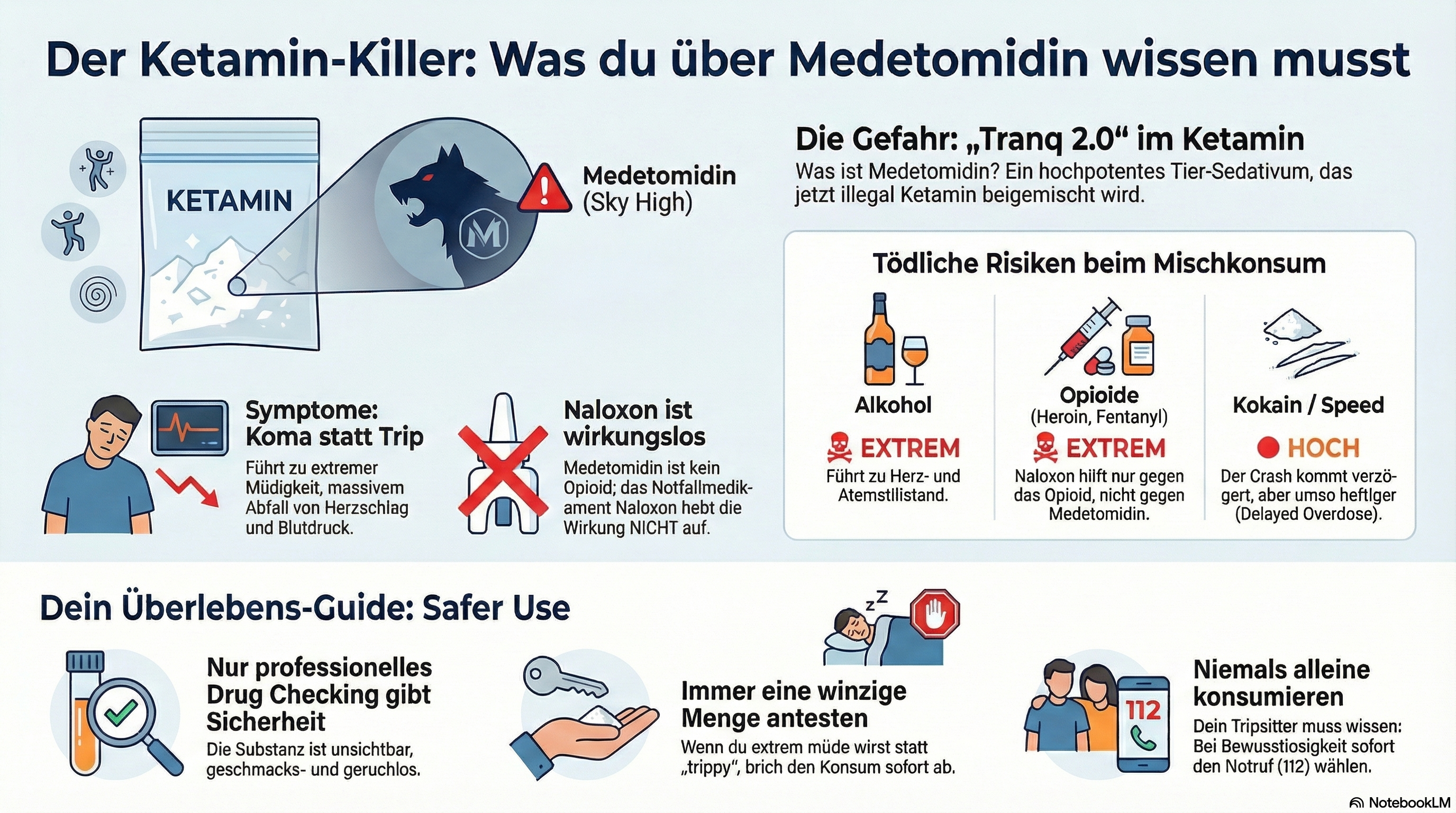 - [Neue Gefahr]: Medetomidin („Sky High“) ist ein extrem starkes Tier-Sedativum, das jetzt in Ketamin gefunden wurde (UK/Europa).