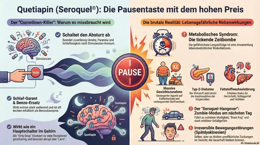 Die Analyse zeigt deutlich, dass Quetiapin ein hochwirksames psychiatrisches Medikament ist und keine harmlose Schlaf- oder Lifestyle-Pille. Der kurzfristige „Nutzen“ – das schnelle Ausschalten des Comedowns – wird mit verheerenden langfristigen Gesundheitsrisiken bezahlt (Metabolisches Syndrom). Unsere Aufgabe ist eine faktenbasierte Aufklärung, die für diese Gefahren sensibilisiert und gesündere Bewältigungsstrategien aufzeigt.