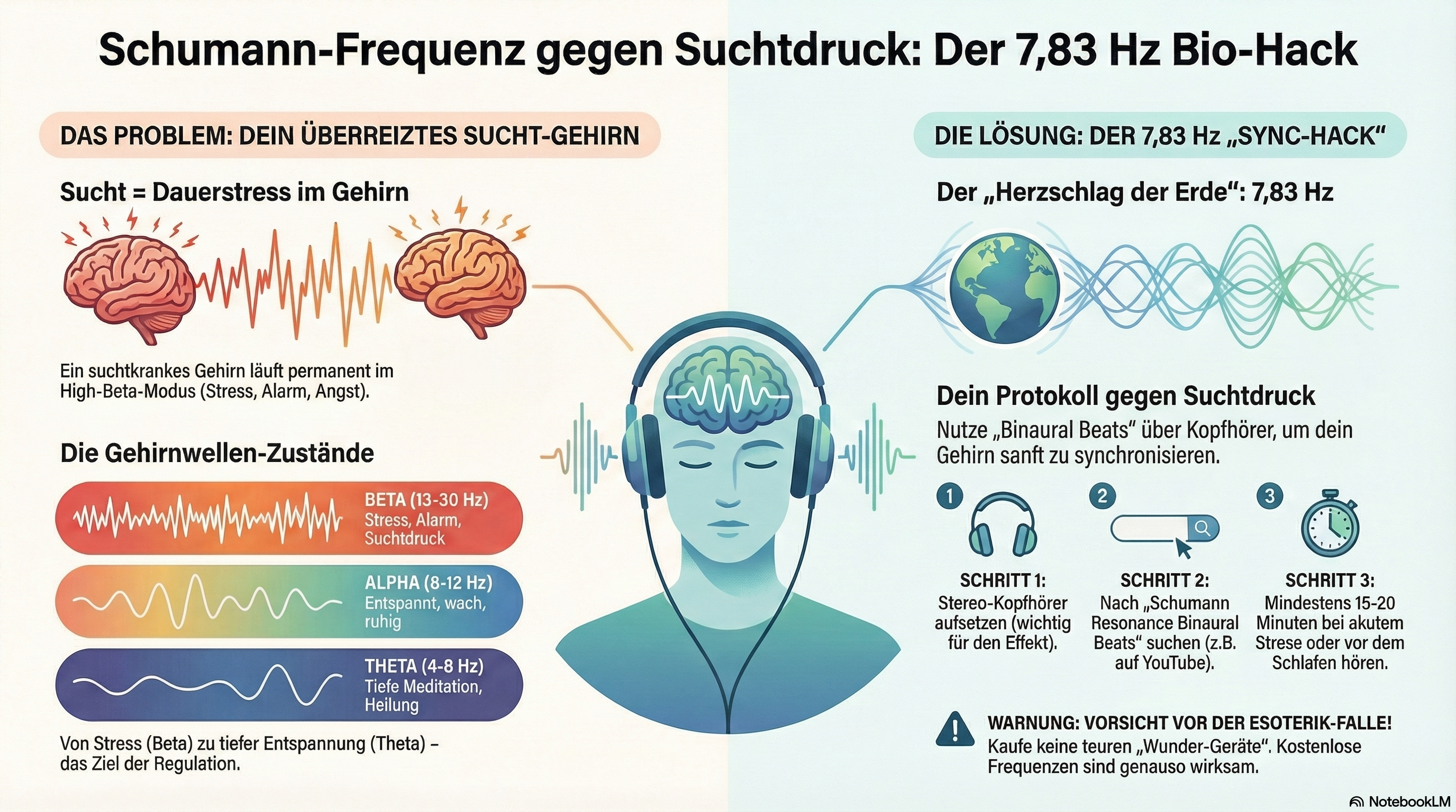 - Der Sucht-Link: Sucht ist oft purer Stress (High-Beta-Wellen). Das Hören der Schumann-Frequenz (via Binaurale Beats) kann helfen, das Nervensystem zu „entstressen“ und Suchtdruck (Craving) natürlich zu senken.