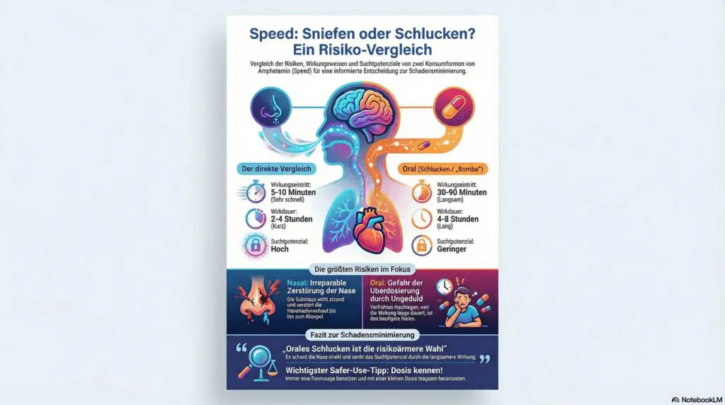 Hey Du, heute reden wir Klartext über eine der häufigsten Fragen in der Partyszene: Was ist der „bessere“ Weg, Amphetamin (Speed) zu konsumieren? Die klassische Line durch die Nase ziehen oder das Pulver als „Bombe“ schlucken? Viele denken, der Unterschied liegt nur im Tempo des Rausches. Aber die Wahrheit ist: Die Art, wie du eine Droge nimmst (die Konsumform), hat massive Auswirkungen auf die Wirkung, die Suchtgefahr und vor allem auf die spezifischen körperlichen Schäden. Lass uns das mal ohne Tabus und aus der Perspektive der Schadensminimierung (Harm Reduction) beleuchten.