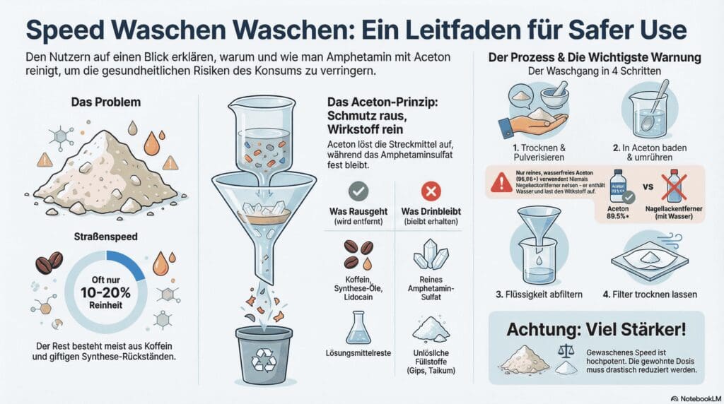 Fazit zur Wirksamkeit: Die Acetonwäsche reduziert die Ätzwirkung (durch Entfernung von Säureresten) und die kardiale Belastung (durch Entfernung von Koffein). Sie macht den Konsum verträglicher, aber die Neurotoxizität des Amphetamins bleibt bestehen.