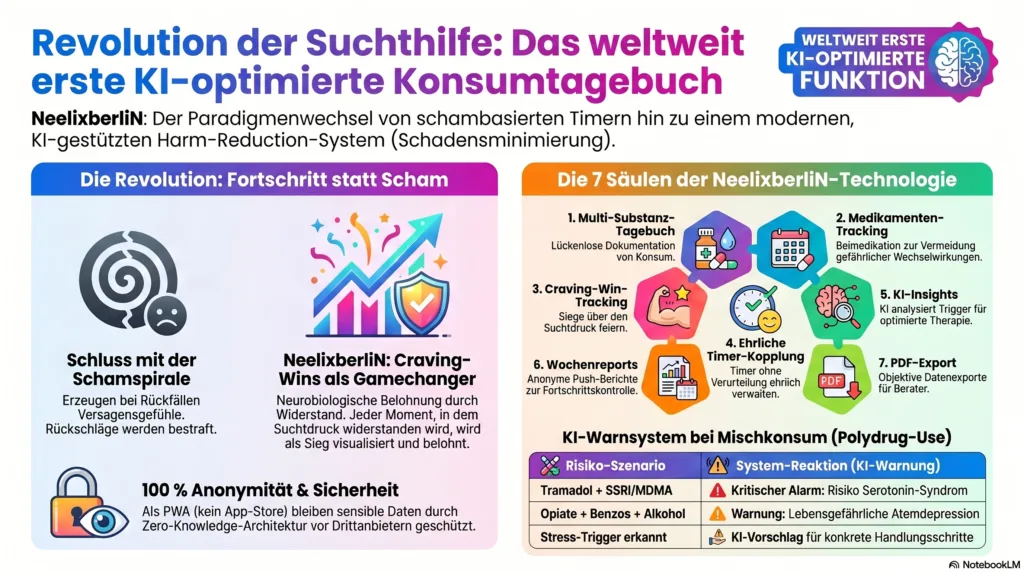Das NeelixberliN Harm-Reduction-Tool ist eine 100 % anonyme Progressive Web App für Sucht-Management, die auf Craving-Wins, KI-gestützte Mustererkennung und Echtzeit-Warnungen bei Mischkonsum setzt.