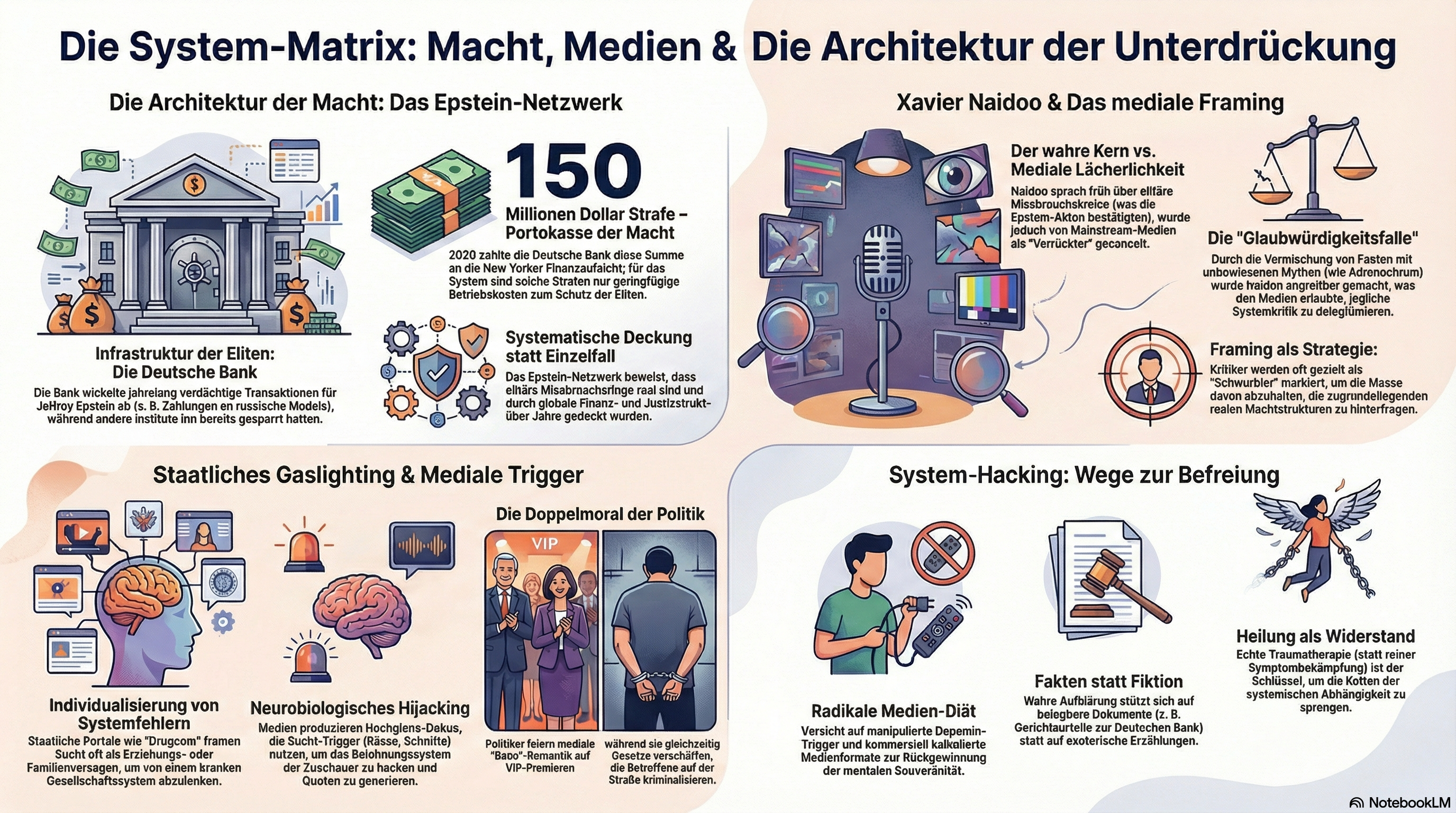 - Das Paradox der Macht: Während Pharma-Giganten (Sacklers) und Eliten (Epstein) durch Milliarden gedeckt werden und Banken (Deutsche Bank) nur geringe Strafen zahlen, wird der traumatisierte Endkonsument durch BtmG und MPU systematisch ruiniert.