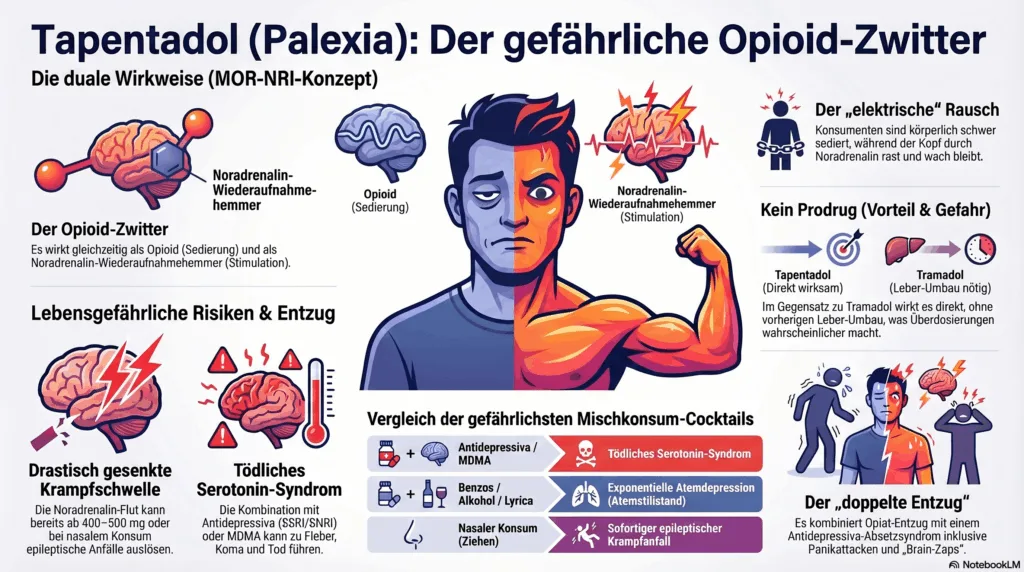 In der aktuellen klinischen Praxis und Suchtberatung tritt eine Substanz zunehmend in den Vordergrund, die auf dem Schwarzmarkt oft fälschlicherweise als „milde Alternative“ zu Oxycodon oder als „effizienteres Tramadol“ propagiert wird: Tapentadol (Handelsname u. a. Palexia). Für Suchtberater und Mediziner ist es von strategischer Bedeutung, die spezifische Gefährlichkeit dieses Wirkstoffs zu verstehen, da er sich pharmakologisch grundlegend von klassischen Opioiden unterscheidet.