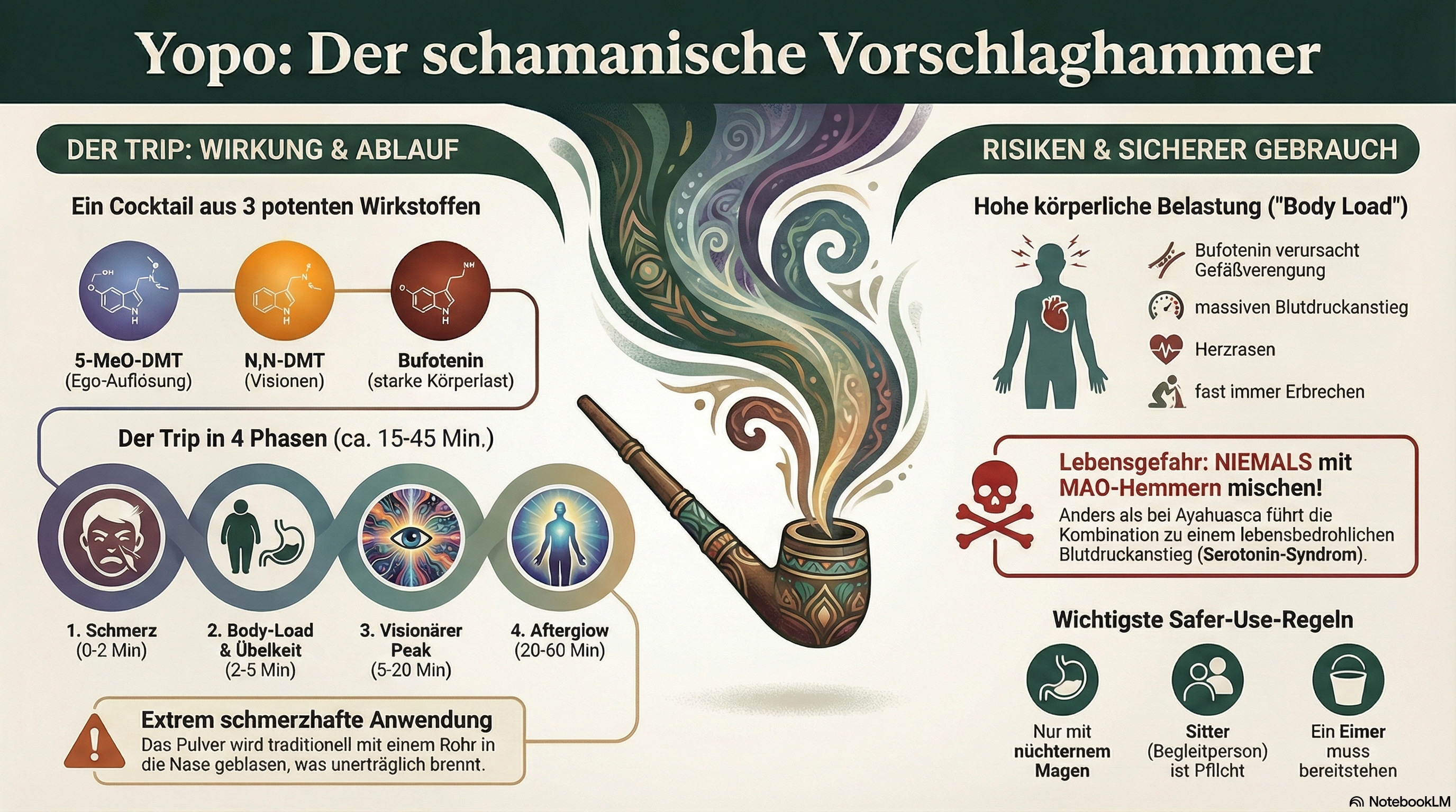 Lern-Brücke: Diese extreme körperliche Intensität, insbesondere der durch Bufotenin verursachte „Body Load“, ist die direkte Quelle der spezifischen und ernsten Risiken von Yopo.